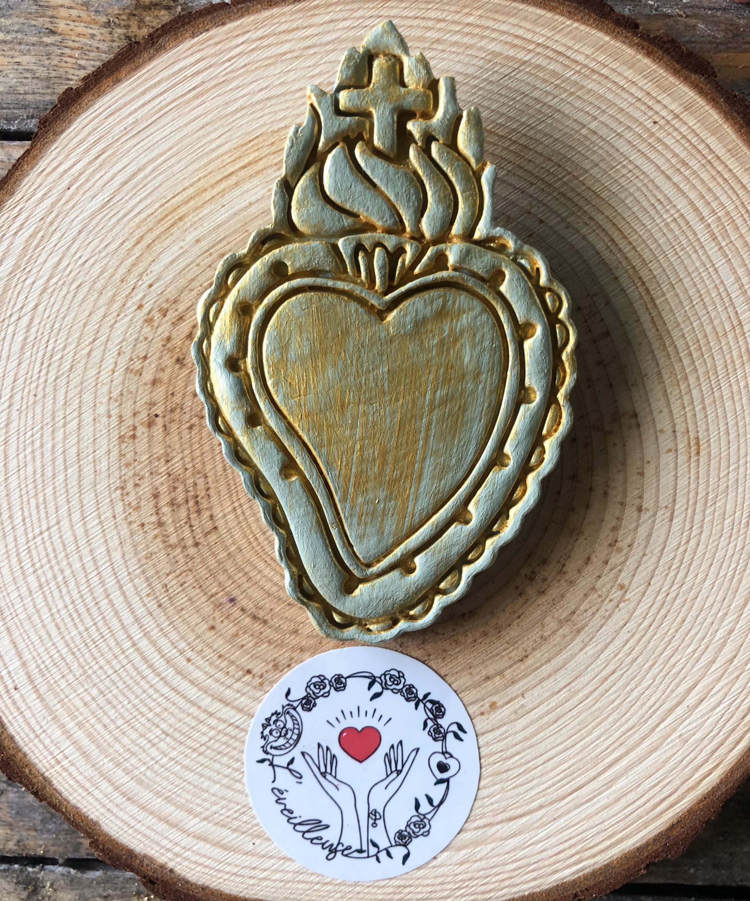 Sacré-Coeur ex-voto,en argile, entièrement réalisé à la main, dimension 10 x 6,5 cm, sauge patiné doré.