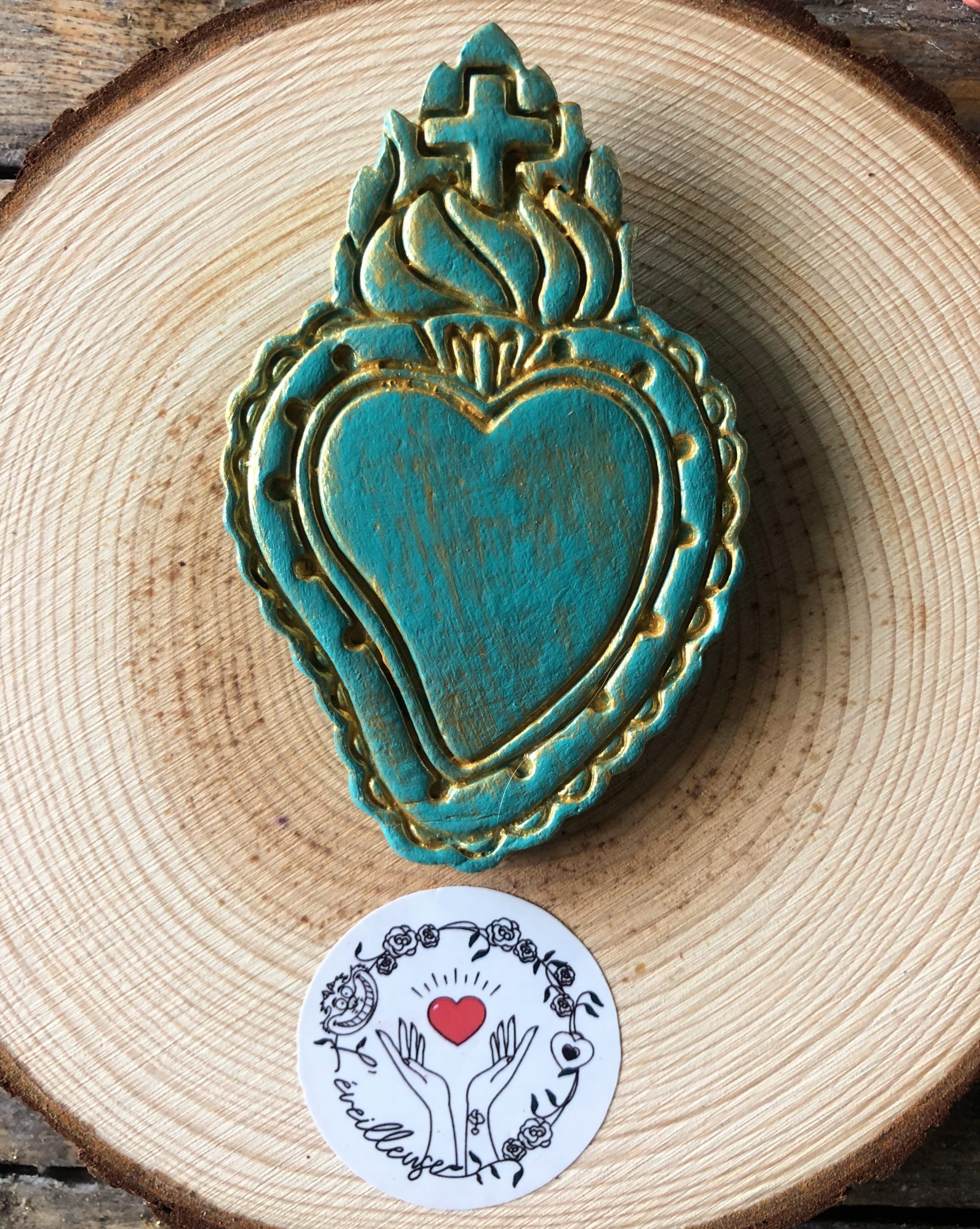 Sacré-Coeur ex-voto,en argile, entièrement réalisé à la main, dimension 10 x 6,5 cm, vert émeraude patiné doré.